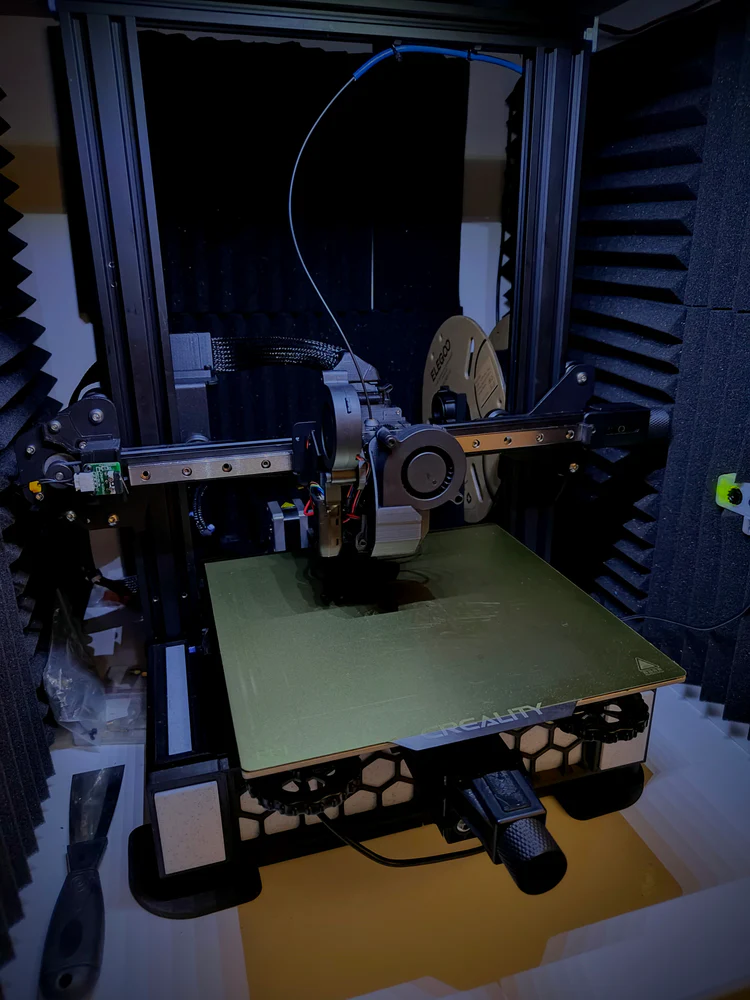 This Ender 3 V2 has been heavily modified and tuned for detail work. It runs Klipper with linear rails, input shaping, pressure advance, and a Sprite hotend with a volcano nozzle and custom shroud. Self levelling, upgraded heater and thermistor, and a PEI build plate keep prints consistent. Slower than the P1S, but carefully dialled in for clean lithophanes.